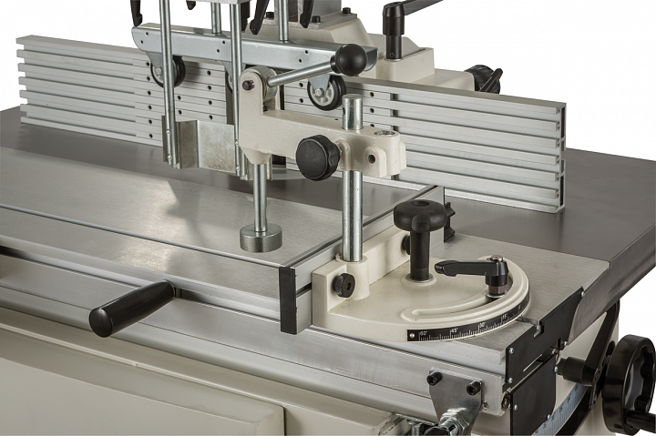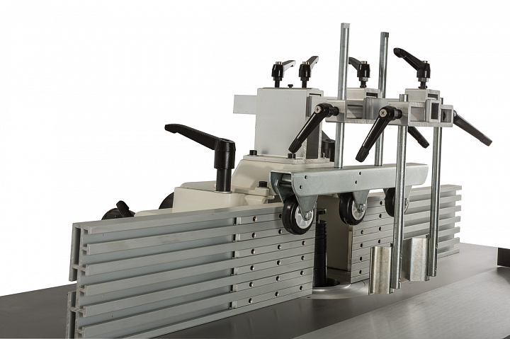 Для работы на основном столе предназначен фрезерный упор, удобный в настройке и точный. На чугунном корпусе, который служит также ограждением фрезы и пылесборным кожухом, закреплён регулируемый верхний прижим, снабжённый обрезиненными роликами, снижающими трение. Подающий и приемный упоры из алюминиевого профиля регулируются по-отдельности при помощи вращающихся рукояток.