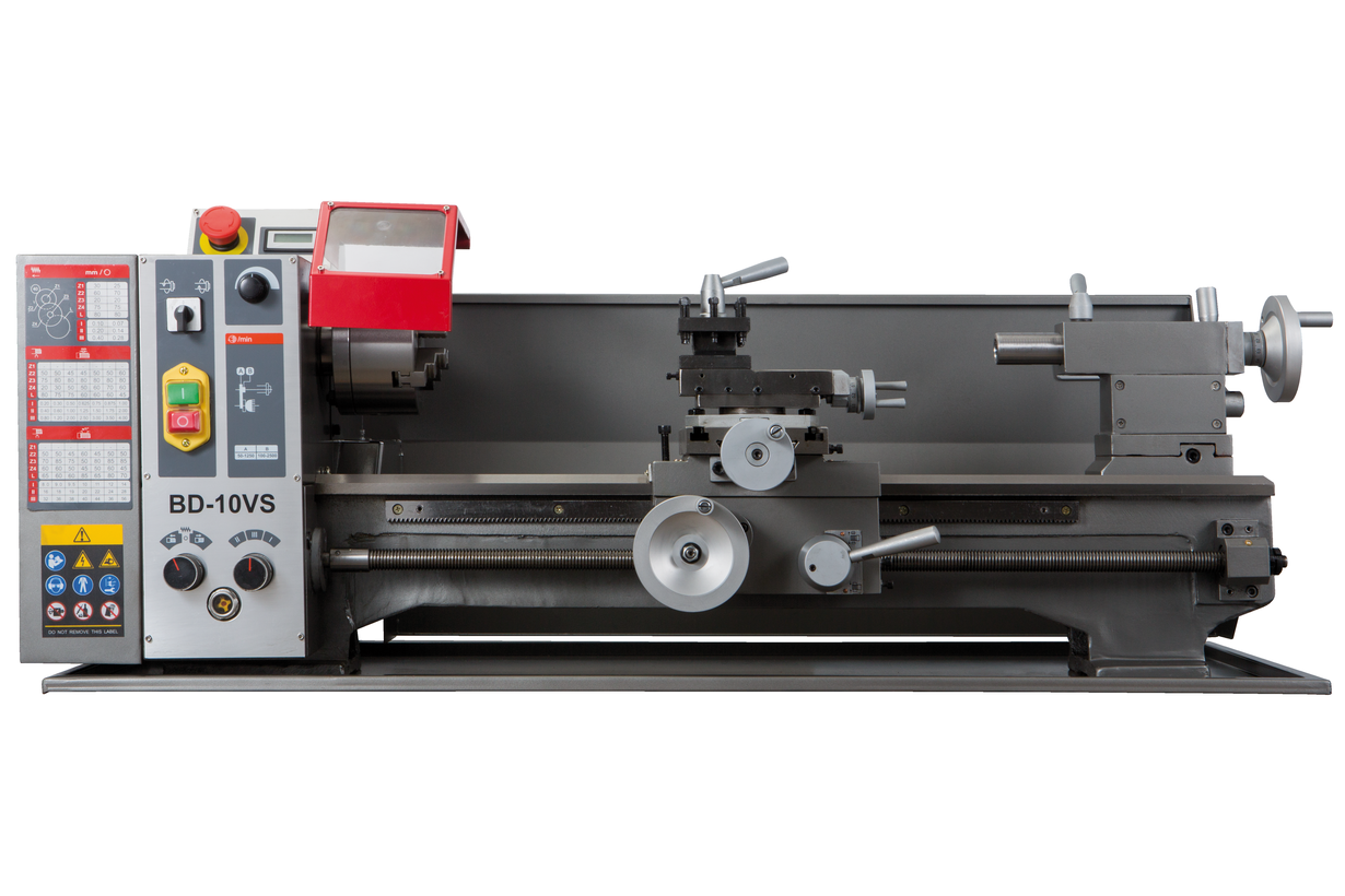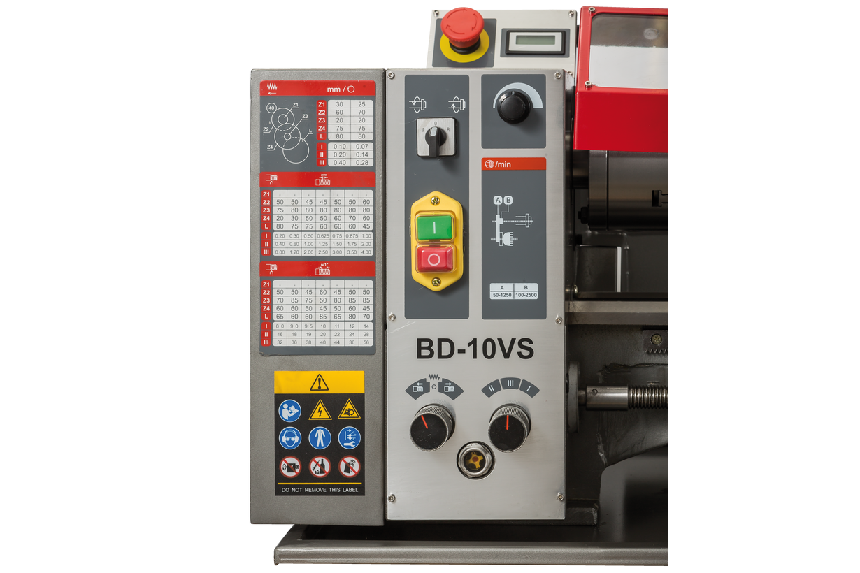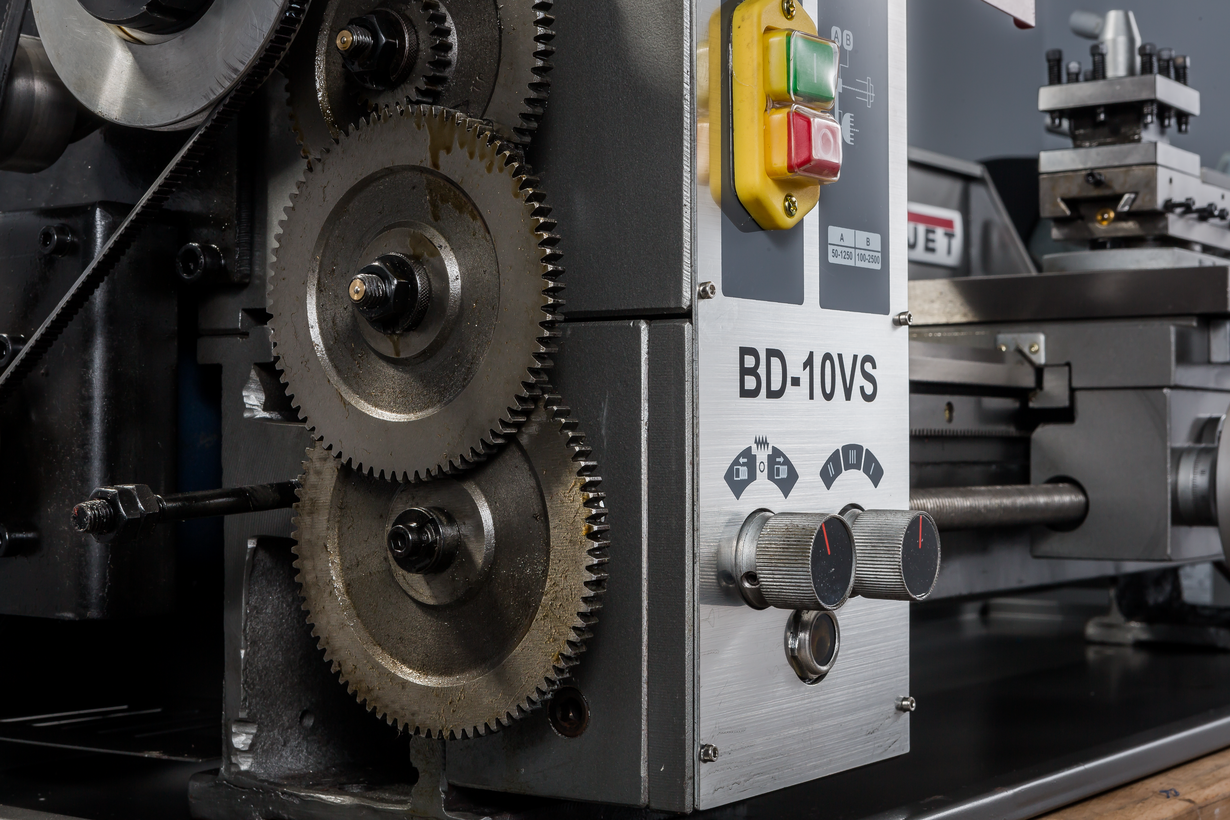 Давайте разберемся какие особенности имеет станок JET BD-10VS. Станок способен нарезать как правую, так и левую резьбу. Режет он метрическую и дюймовую резьбу. Для нарезки резьбы используются сменные металлические шестерни, они идут в комплекте со станком. На станке установлена коробка подач – это еще одна важная особенность станка. После того, как Вы наберете нужную Вам гитару из шестеренок на резьбу или автоматическую подачу, у Вас появится три скорости или три возможные резьбы. Например, набирая автоматическую подачу 0,1 мм на один оборот шпинделя из одного комплекта шестерней вы получаете три автоматические подачи: 0,1 мм/оборот, 0,2 и 0,4 мм на один оборот шпинделя. Таким образом на станке имея два набора шестеренок мы получаем шесть автоматических подач, причем перебирать их каждый раз не потребуется, мы просто поворачиваем ручку на панели станка. Правда это удобно?