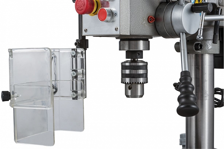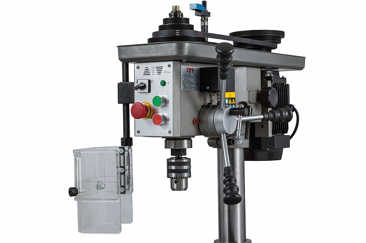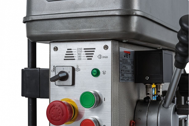 Станок сверлильный настольный IDTP-16 возглавил новую линейку станков JET с возможностью нарезать резьбу. Данный станок производится в Китае, что позволяет снизить стоимость изготовления, а это непосредственно влияет на цену станка в России. Станок оснащен мощным двигателем 500Вт и способен в режиме долгих нагрузок нарезать резьбу до М12. На станке установлен асинхронный двигатель, на который установлен шкив с 5-я ручьями, перекидывая ремень по ручьям шкива, вы меняете скорость от 200 до 2350 оборотов в минуту. Данное решение в тандеме с легкой натяжкой двигателя и надежной фиксацией, позволяет сохранить и передать хороший момент на шпинделе. Основание станка отлито из серого чугуна, станок устанавливается на верстак или стол, подстолье и фиксируется болтами. Надежная фиксация позволяет уменьшить вибрации. В основание вставляется толстостенная труба, на которую непосредственно крепится голова сверлильного станка. В управление станок достаточно прост.