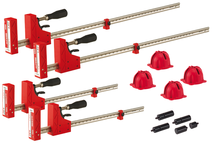 Jet 70411EU набор корпусных струбцин с необходимыми для удобной работы принадлежностями, предназначен для сборки на клею конструкций из дерева. Включает в себя четыре корпусных струбцины (подробное описание ниже) и вспомогательные приспособления. Это блоки «крест на крест» для удерживания под прямым углом и цилиндрические упоры. Они вкручиваются в корпуса блоков «крест на крест» или в упоры струбцин и применяются для их фиксации на рабочей поверхности с круглыми монтажными отверстиями.