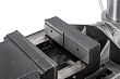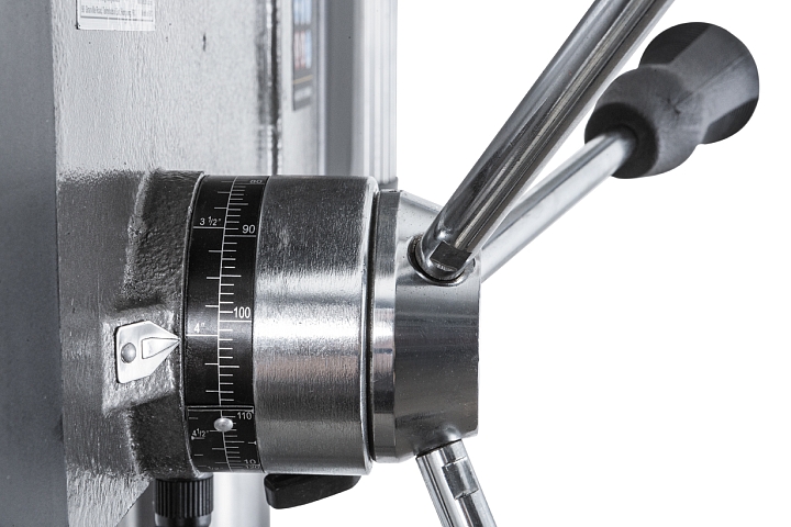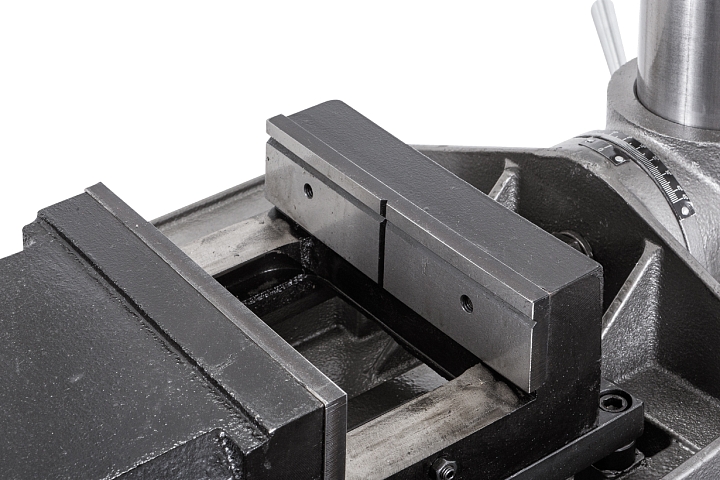 Стол имеет возможность поворота вокруг колонны на 360° и наклона вправо/влево по градуированной шкале на ±45°. Также может устанавливаться под углом в 90° для сверления в торце длинной заготовки. С другой стороны рабочего стола размещены встроенные тиски с шириной губок 210мм, расходом на 165мм и величиной перемещения вперед/назад на 165мм. Для упрощения размещения заготовки в тисках на станке встроен лазерный указатель, а для освещения рабочей зоны – светодиодная лампа местного освещения.